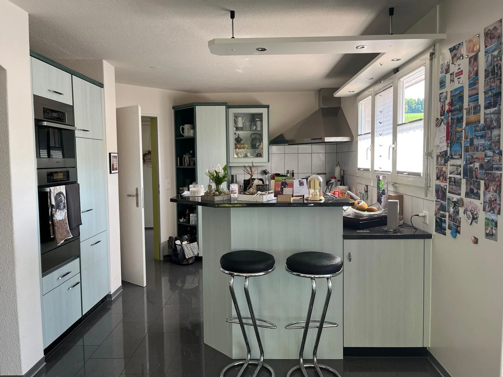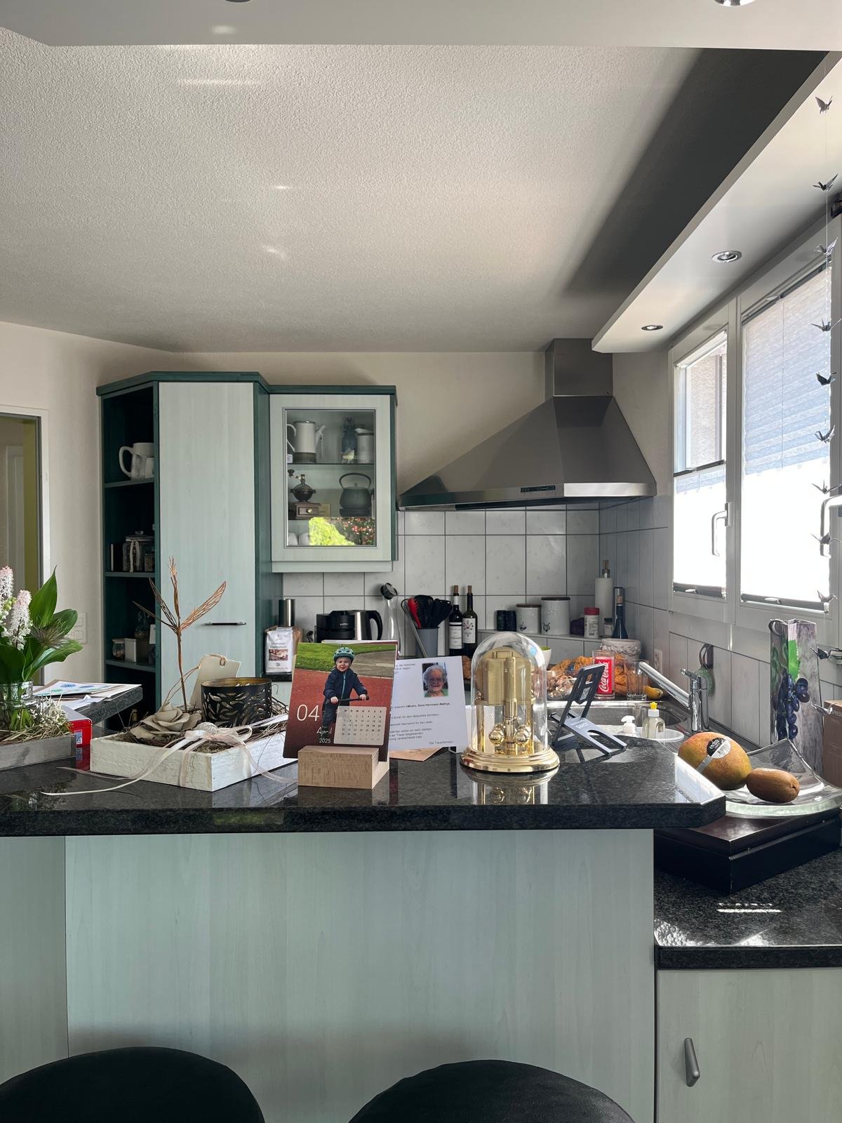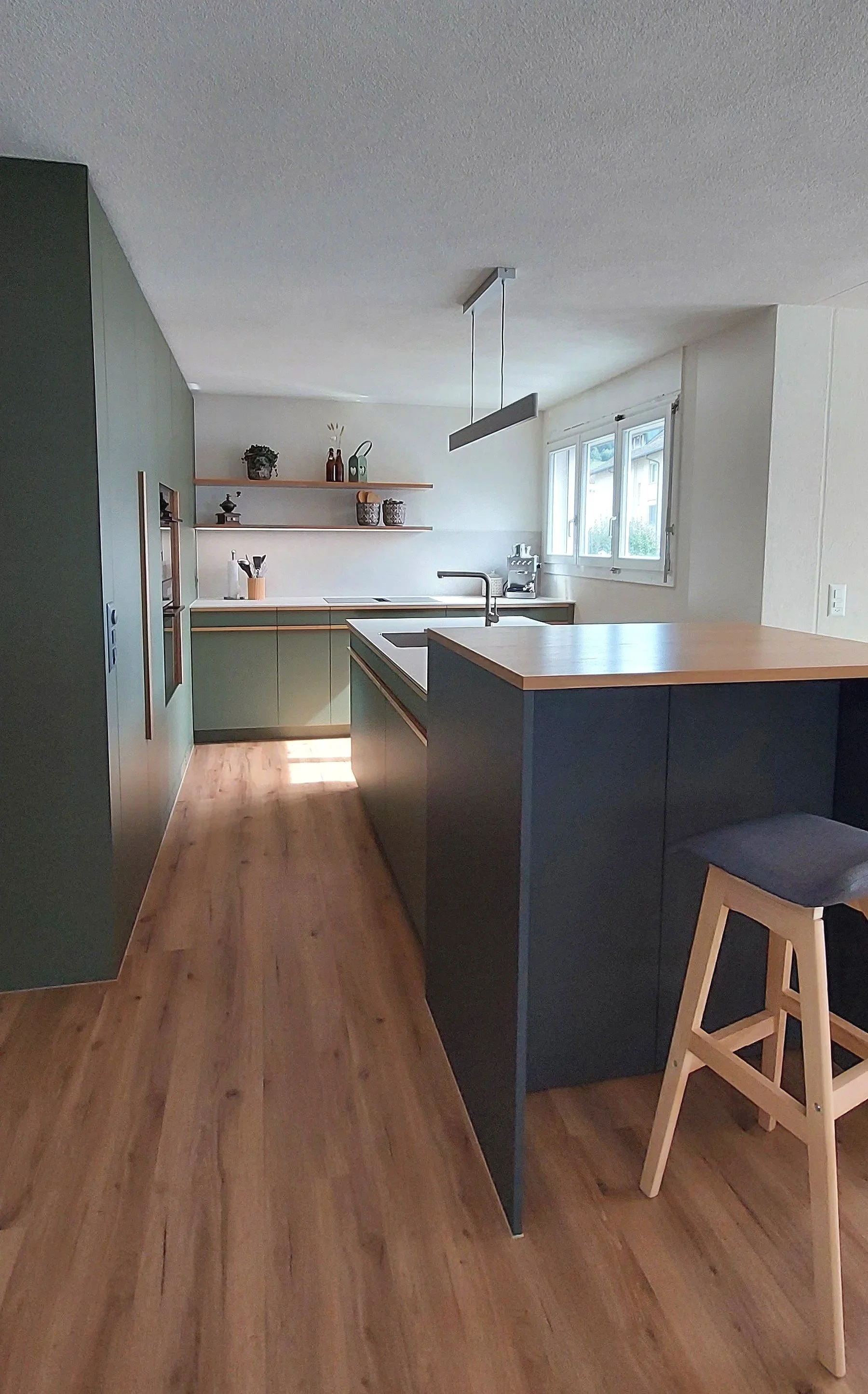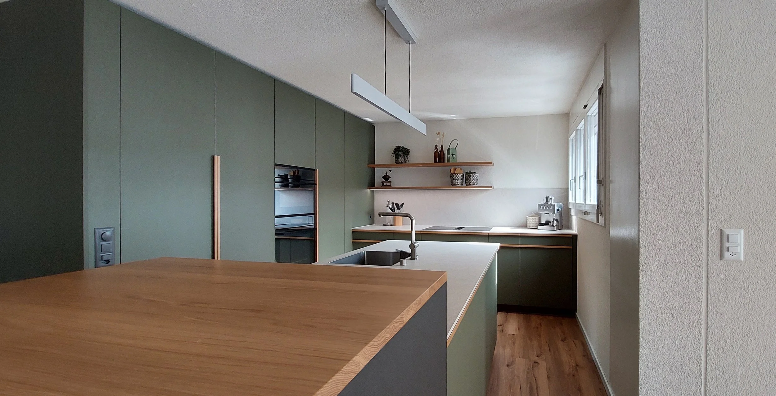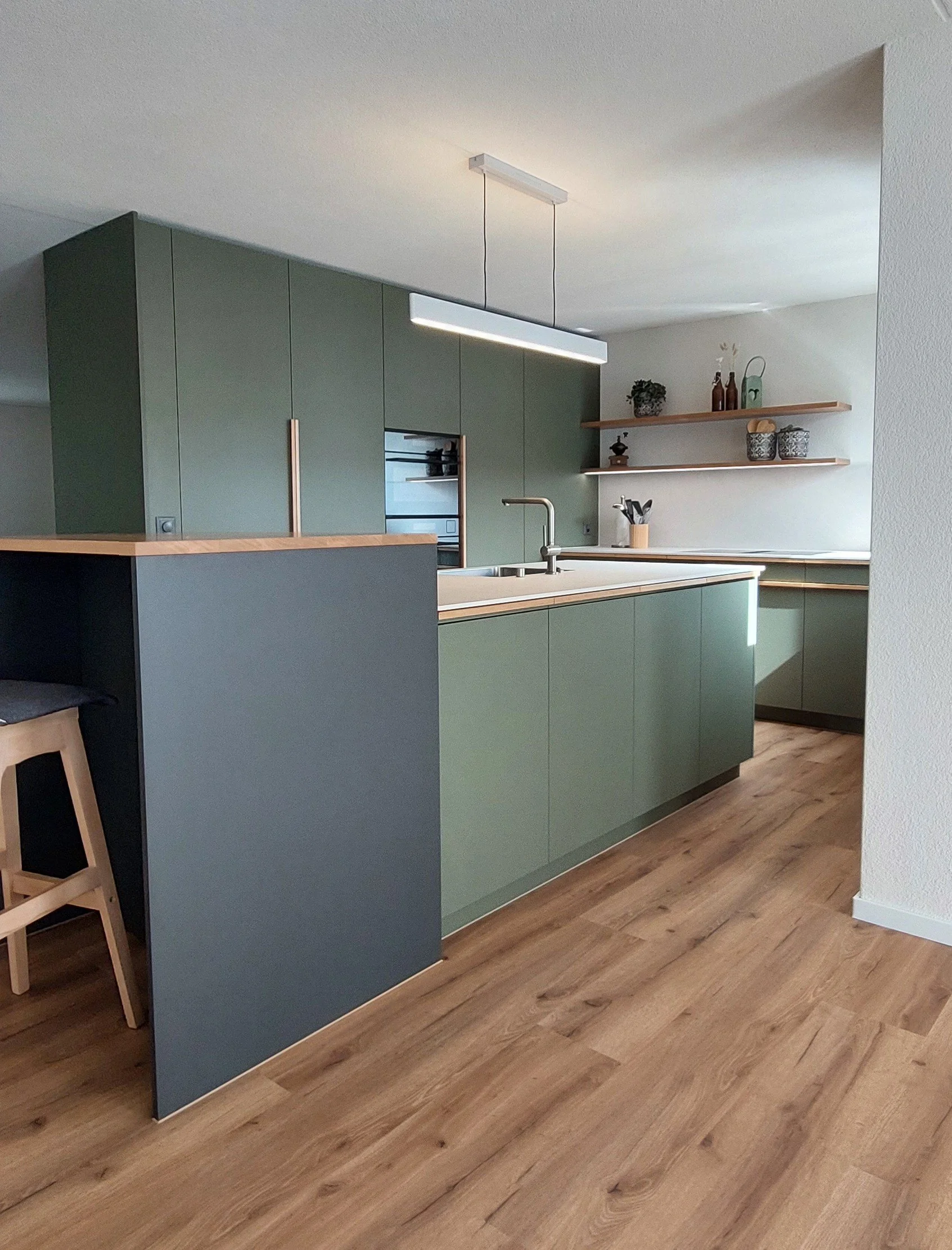 Bei der Umsetzung dieser Küche stand ein zeitloses, modernes Innendesign im Fokus. Sanfte Grüntöne wurden gezielt mit warmen Holzelementen kombiniert, um eine natürliche und ruhige Raumatmosphäre zu schaffen. Klare Linien und harmonisch abgestimmte Materialien verleihen dem Raum Struktur und Eleganz.
